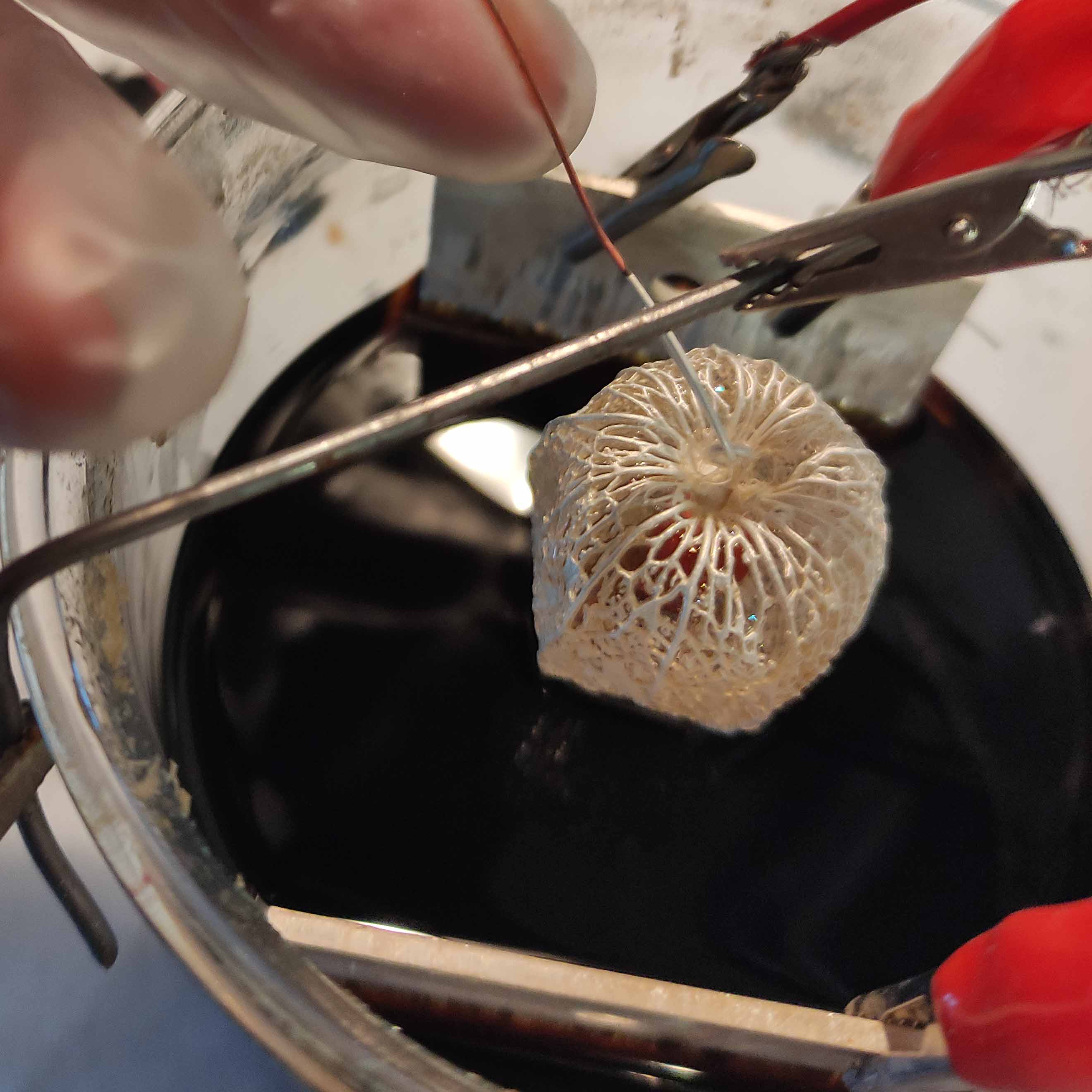 Základem mé tvorby je galvanoplastika (elektroformování) - jedinečná technologie, která umožňuje přenést do kovu skoro jakýkoliv materiál. V galvanické lázni dochází k ukládání kovových iontů na povrch, takže vzniká pevný kovový odlitek, který dokonale zachovává reliéf a texturu původního předmětu.