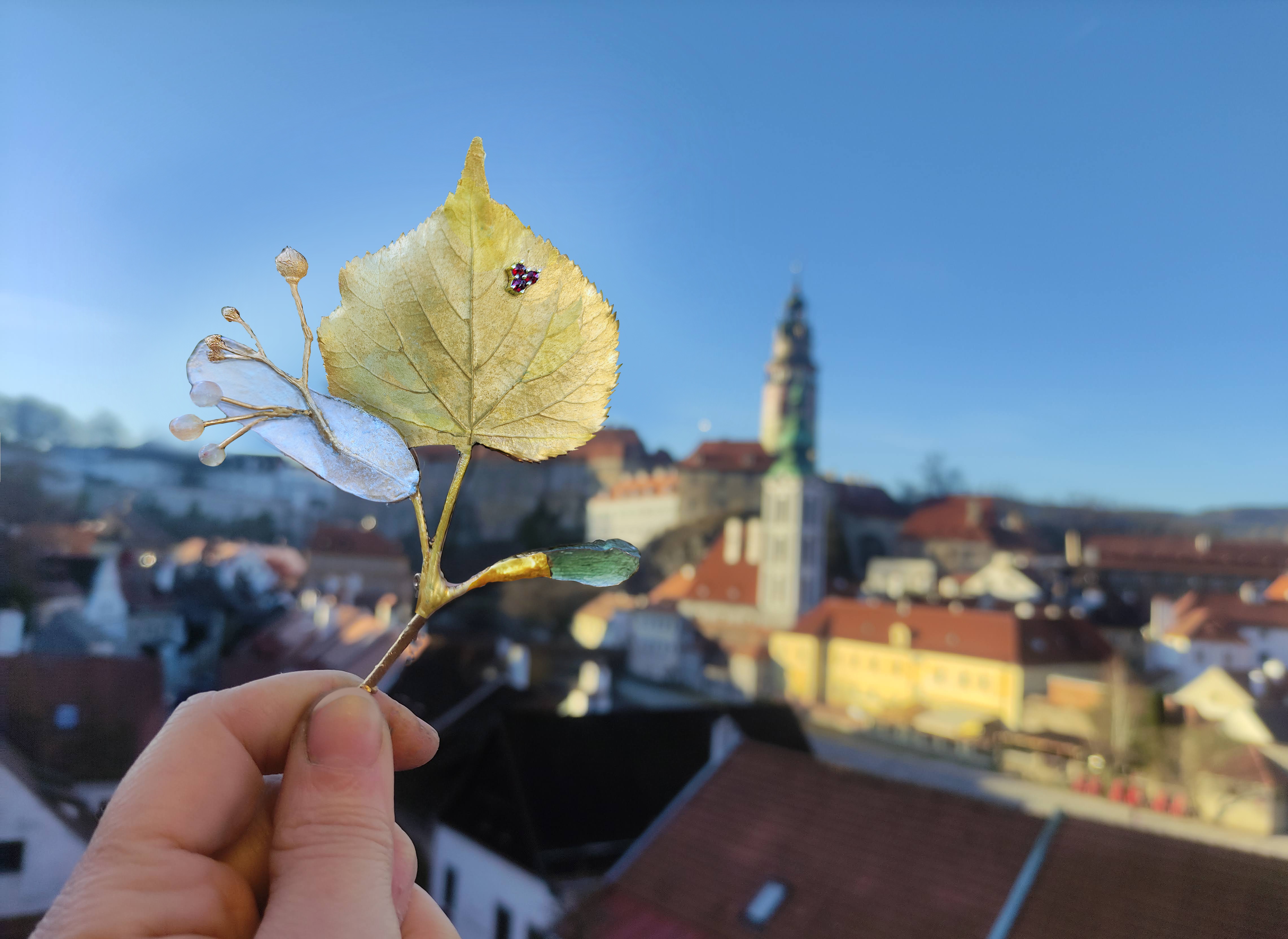V roce 2024 náš lipový stromeček zakořenil a rostl – a spolu s ním se rozvíjela ja a můj projekt České srdce. Začínala jsem s lípovými listy v „měděném kabátku“. Postupně jsem se naučila nanášet na měď drahé kovy – stříbro a zlato – a dnes už umím vytvářet lípové listy zcela z ušlechtilých kovů. Vyvinula jsem vlastní metodu galvanoplastického nanášení drahých kovů, díky níž se šperky z kolekce České srdce staly opravdovými klenoty. Každý list tak nese nejen krásu a sílu přírody, ale i můj osobní růst a cestu šperkařským řemeslem. Kombinace s českými granáty a vltavíny posunula kolekci ještě blíže k pravému významu českého šperku.