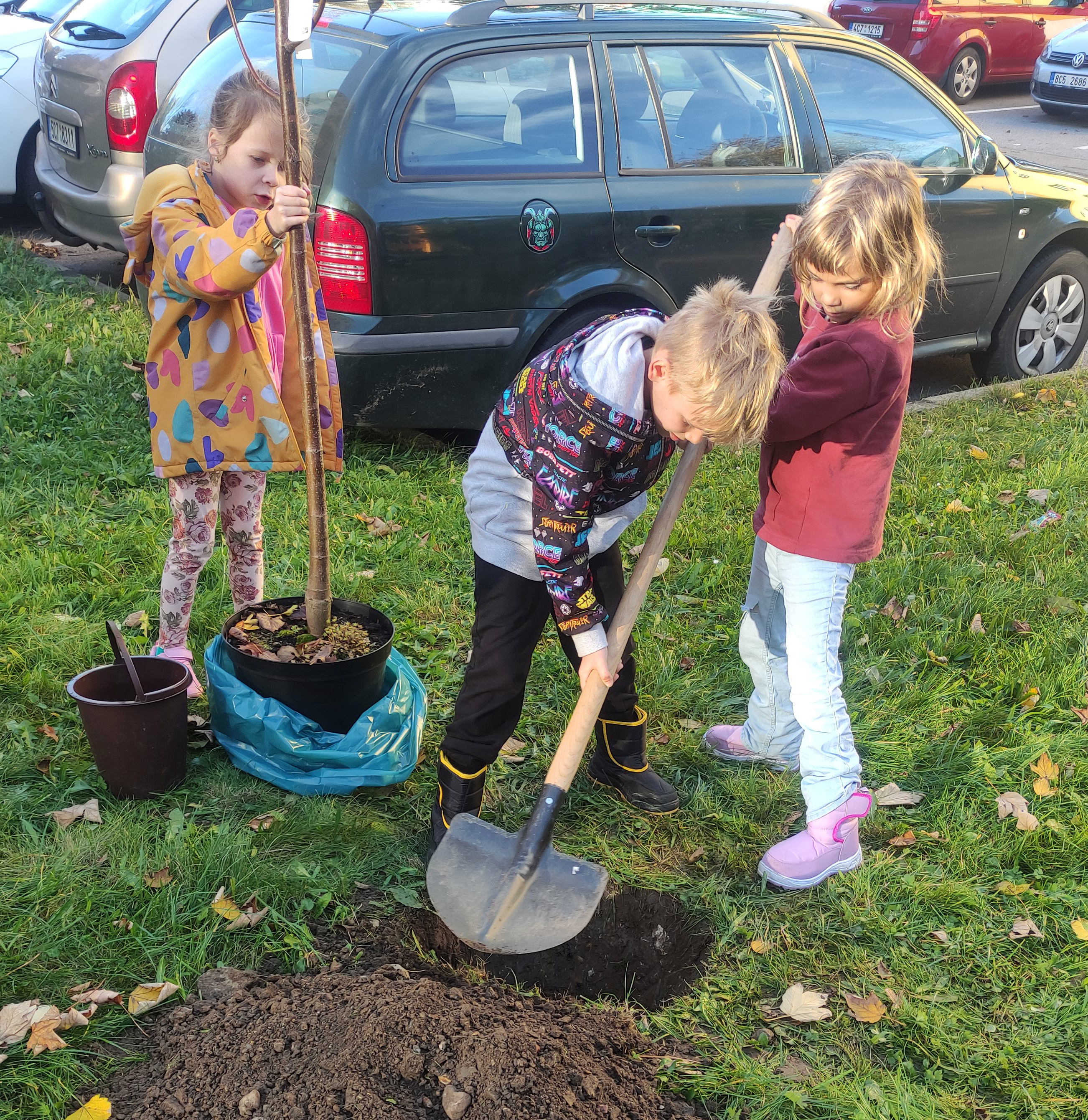 Na foto - 1, 2 - zasazování lipového stromečku před dílnou v Českém Krumlově, 3 - náš poklad