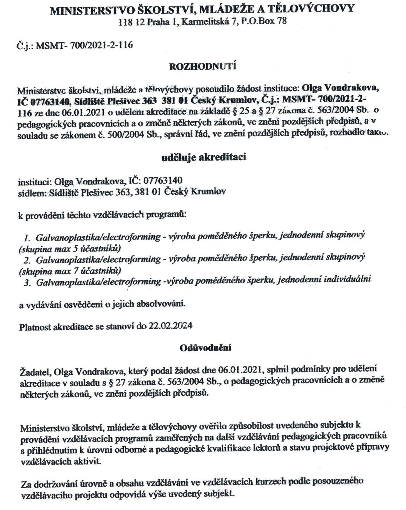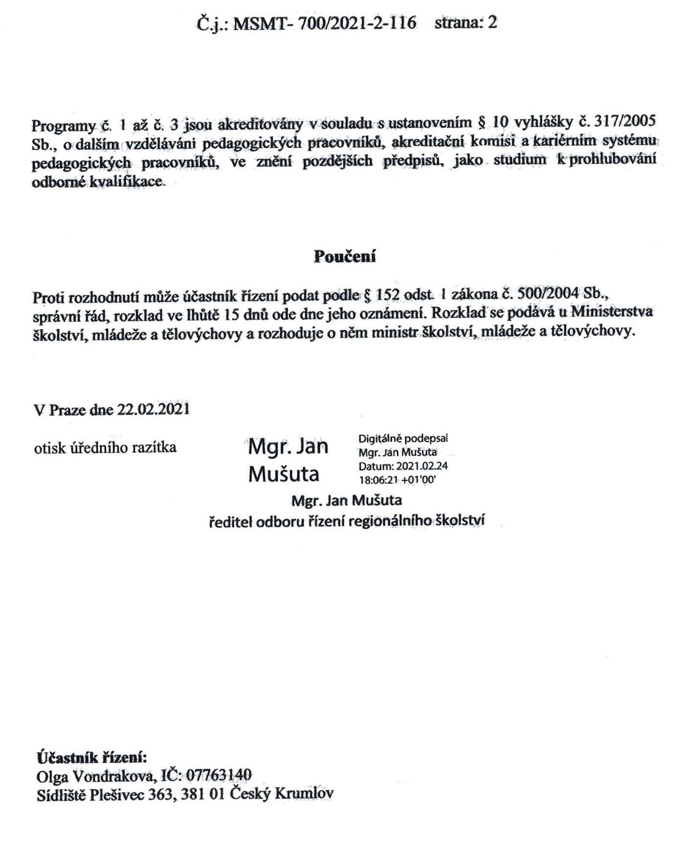 Obrázek1: rozhodnuti o uděleni akreditace MŠMT od 22.02.2021 pod č.j.MŠMT-5422/2021-1