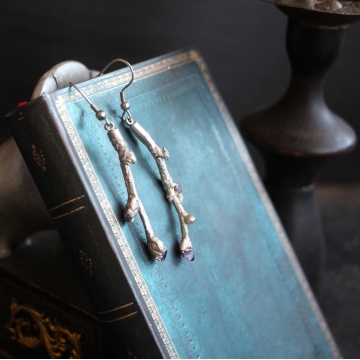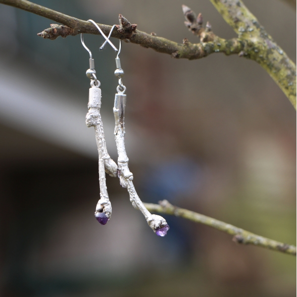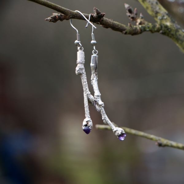 Materiál: lípa, měď, postříbřené, ametyst, háčky chirurgická ocel