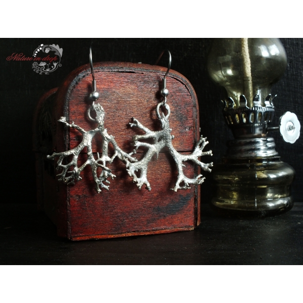 Materiál: lišejník, měď, postříbřené, rhodiované, háčky chirurgická ocel