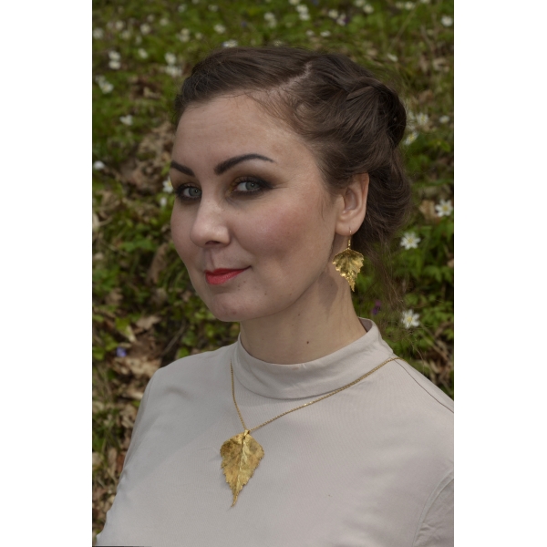 Materiál: listy břízy, měď, postříbřené, pozlacené, háčky zlacená chirurgická ocel