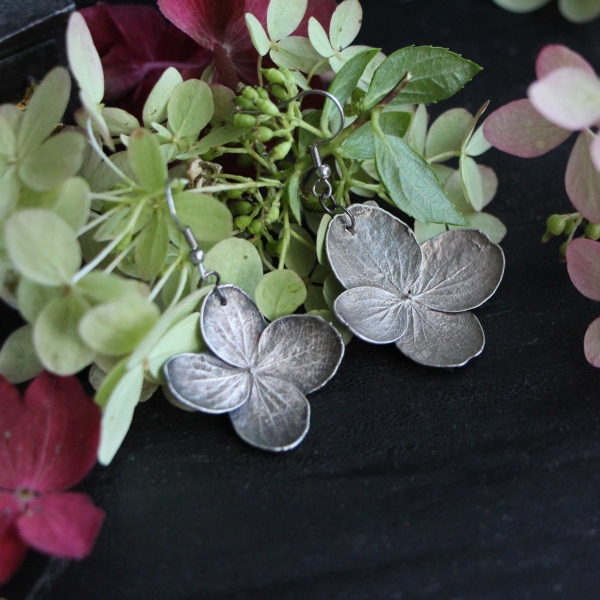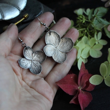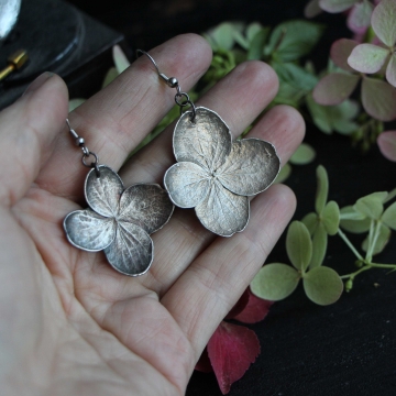 Materiál: květy hortenzie, měď, postříbřené, patina, lak, háčky chirurgická ocel