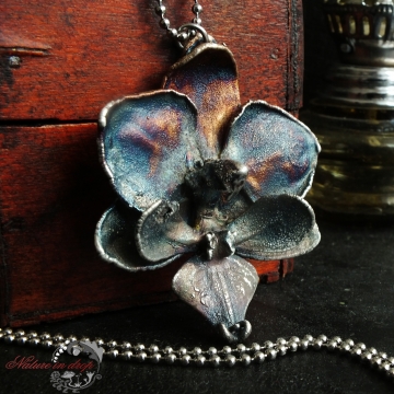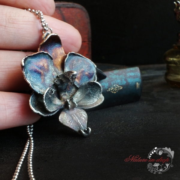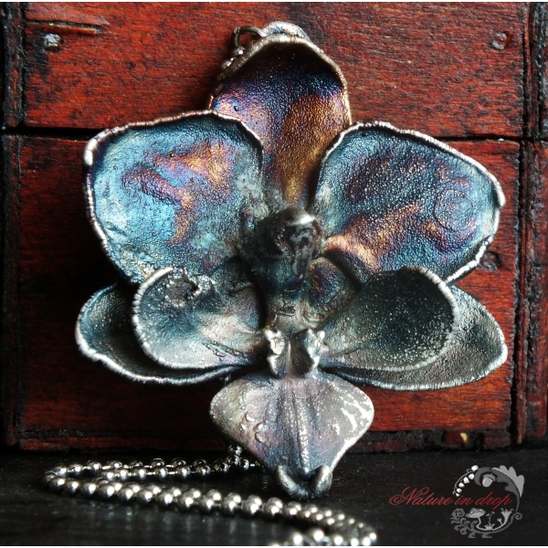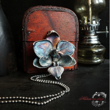 Materiál: květ orchideje, měď, postříbřené, modrá patina, lak, řetízek chirurgická ocel