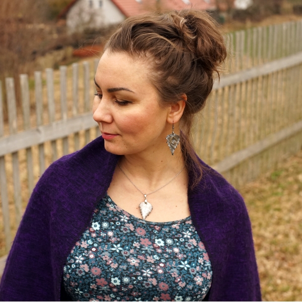 Materiál: list břízy, měď, postříbřené, patinované,řetízekchirurgická ocel
