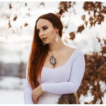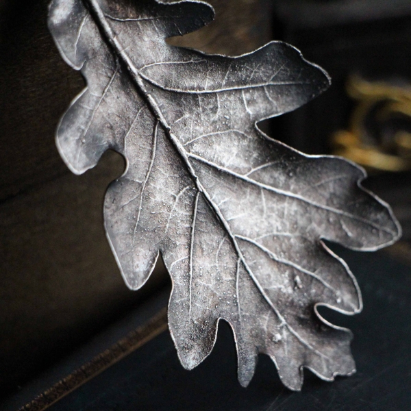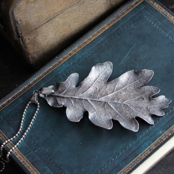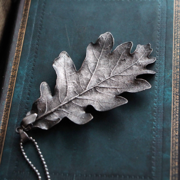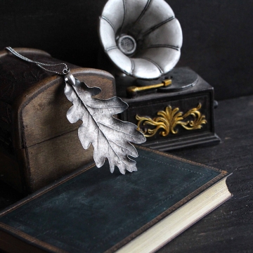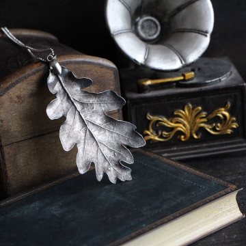 Materiál: dubový list, měď, postříbřené, patina, antioxidační prostředek, řetízek chirurgická ocel