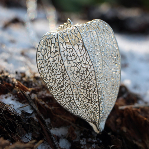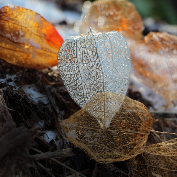 * Neopakovatelný šperk jsem vyrobila a ručně zpracovala v mé čarovné dílně unikátní metodou Galvanoplastiky (Electroformingu) a Galvanostegie (Electroplating). Skutečná přírodnina byla pokovená základní vrstvou mědi, pak postříbřena vrstvičkou ryzího stříbra a následně chráněná proti oxidaci a otěrům.