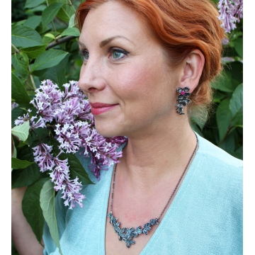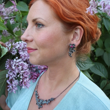 Náušnice z postříbřeného šeříku, rubín