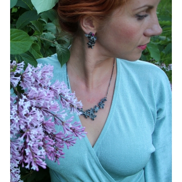 Materiál: šeřík, měď, postříbřené, antioxidační prostředek, rubín, pecky stříbro 925