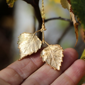 Materiál: listy břízy, měď, postříbřené, pozlacené, háčky zlacená chirurgická ocel