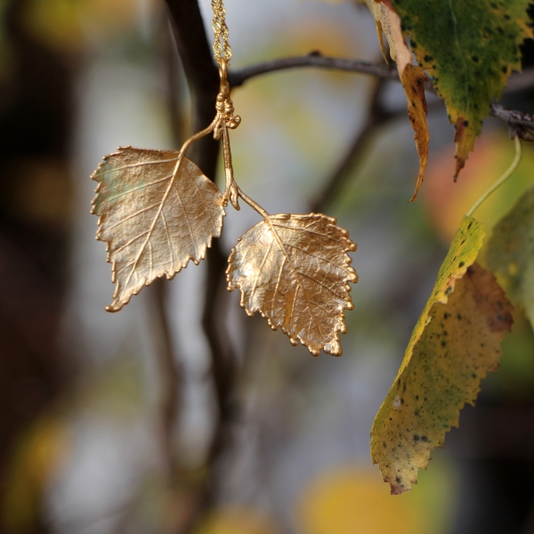 Materiál: listy břízy, měď, postříbřené, pozlacené, řetízek zlacená chirurgická ocel