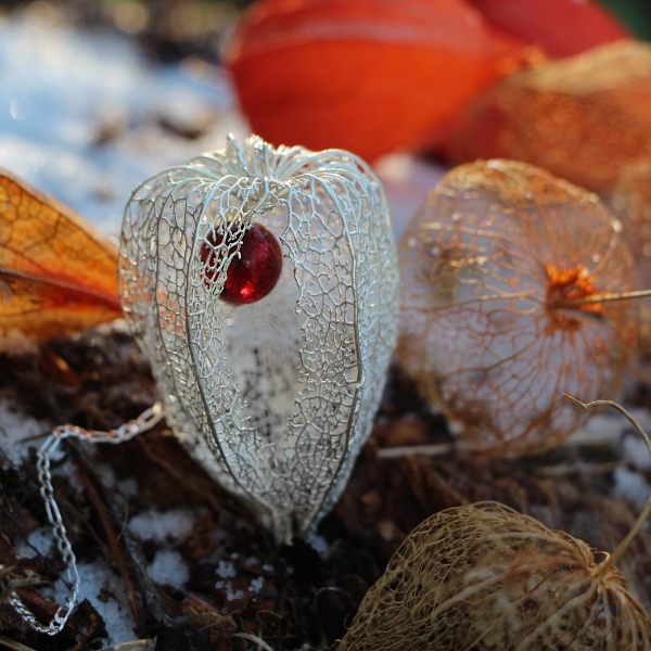 * Neopakovatelný šperk jsem vyrobila a ručně zpracovala v mé čarovné dílně unikátní metodou Galvanoplastiky (Electroformingu)a Galvanostegie (Electroplating). Skutečná přírodnina byla pokovená základní vrstvou mědi, pak postříbřena vrstvičkou ryzího stříbra a následně chráněná proti oxidaci a otěrům.