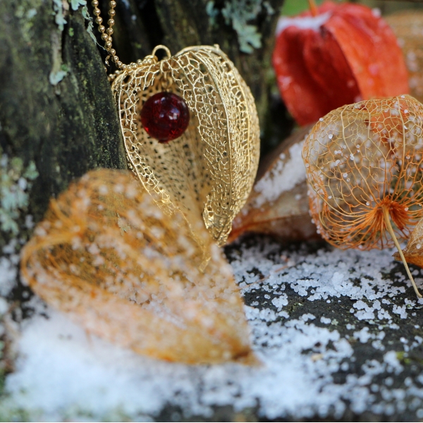 * Neopakovatelný šperk jsem vyrobila a ručně zpracovala v mé čarovné dílně unikátní metodou Galvanoplastiky (Electroformingu) a Galvanostegie (Electroplating). Skutečnou přírodninu jsem pokovila základní vrstvou mědi, pak postříbřila vrstvičkou ryzího stříbra a následně pozlatila 23 karátovým zlatem.