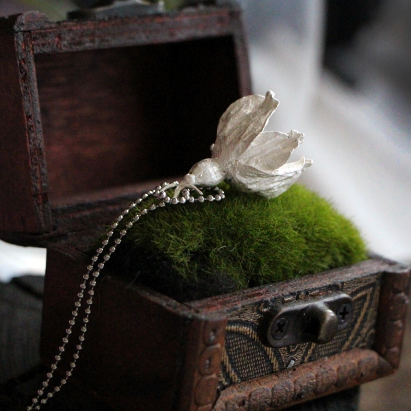 Materiál: květ bledule, měď, postříbřené, patina, antioxidační prostředek, řetízek chirurgická ocel