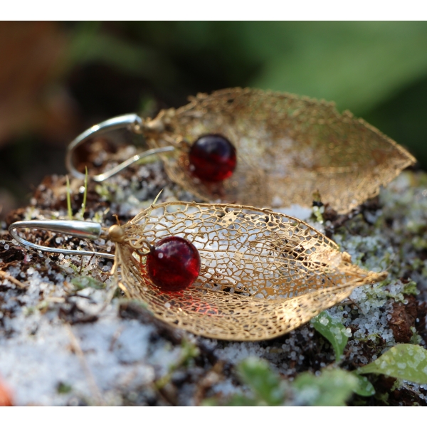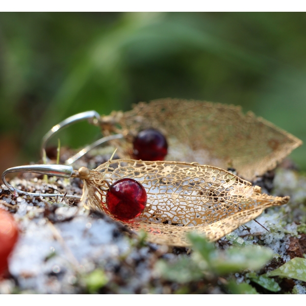 Materiál: mochyně, měď, pozlacené, háčky ze stříbra 925 pozlaceného 23 K zlatem, kulička jantaru cca 1 cm