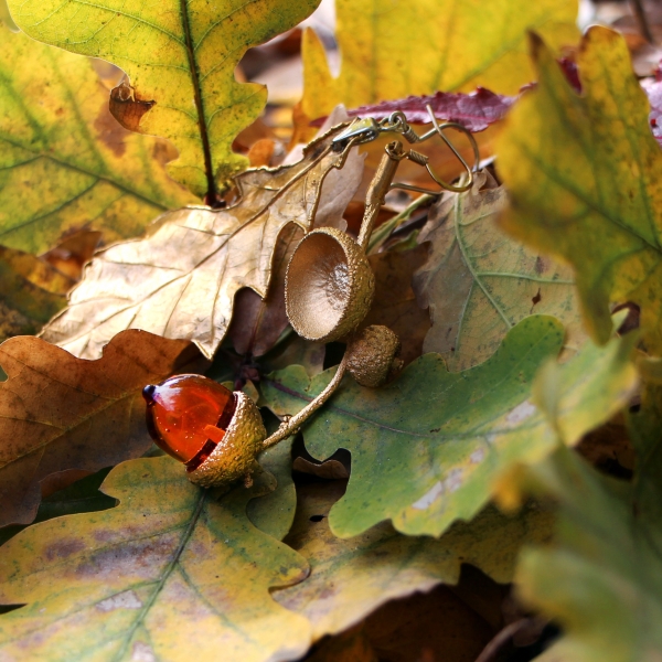 Materiál: dub, měď, chirurgická ocel, pozlacené, skleněný korálek