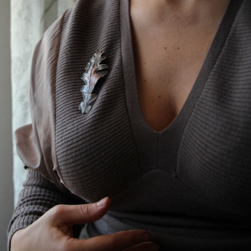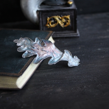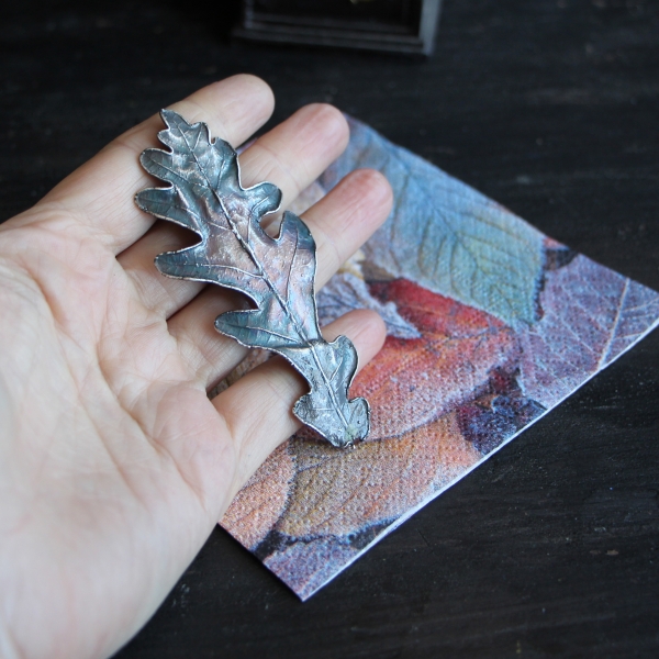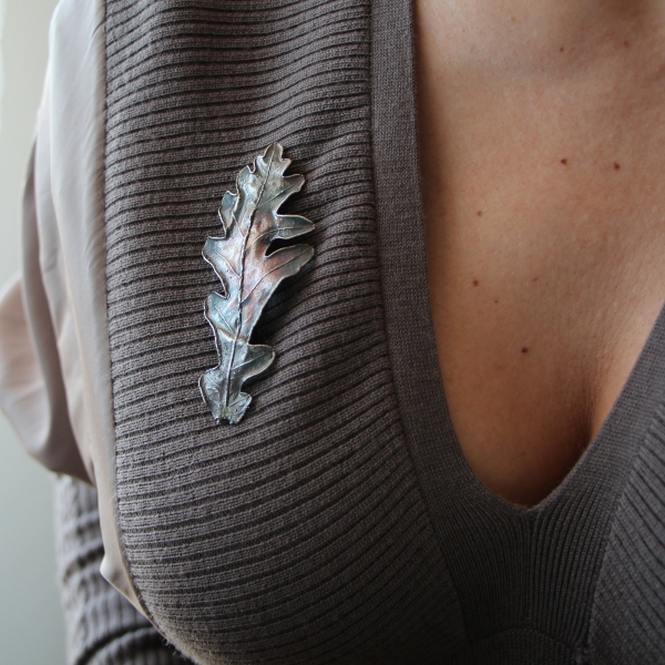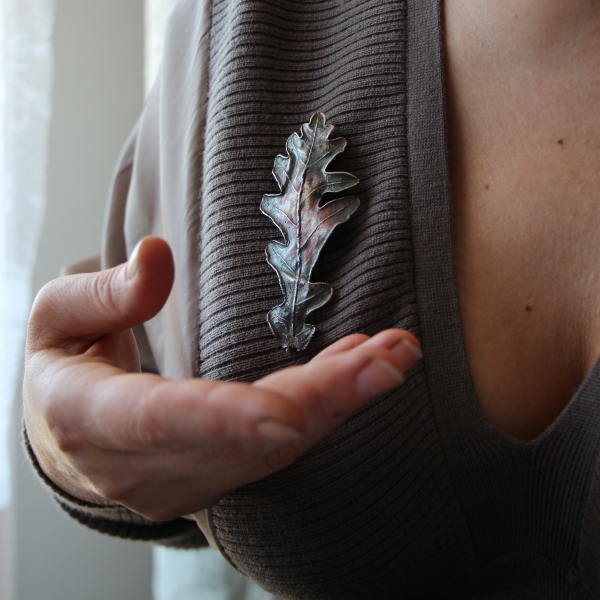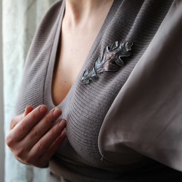 Material: oak leaf, copper, surgical steel, silver-plate, patina, lacquer