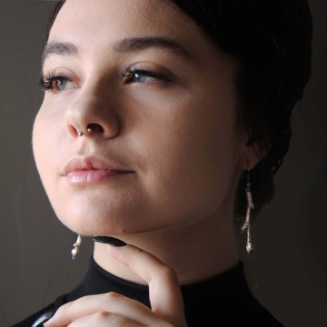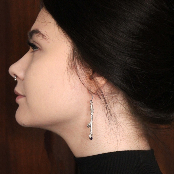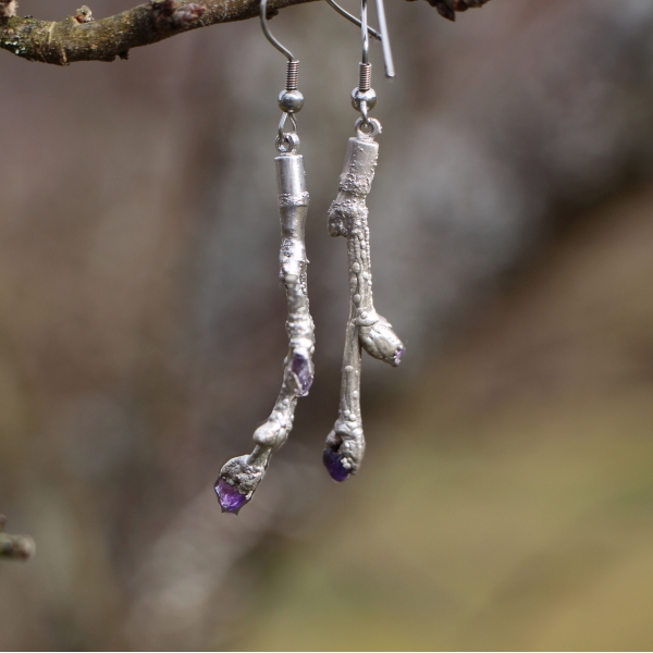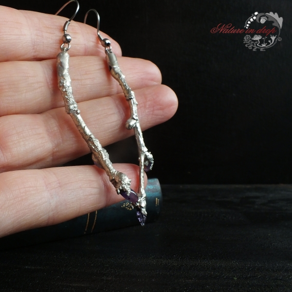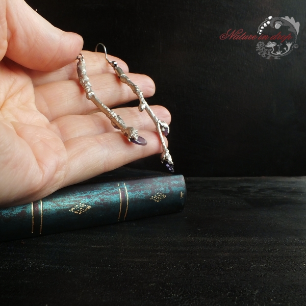 Material: linden, copper, silver-plate, rhodium-plate, amethyst, surgical steel hooks