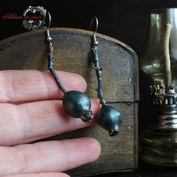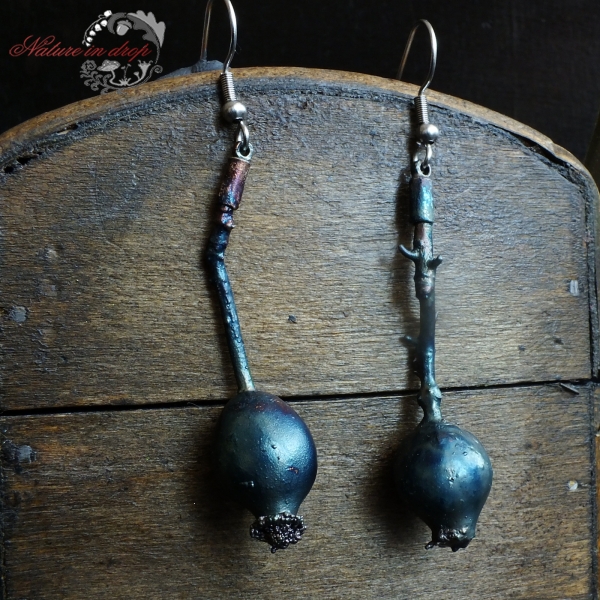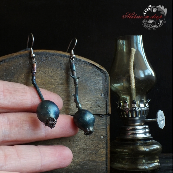 Material: rose hips, copper, silver-plate, patina, lacquer, surgical steel hooks