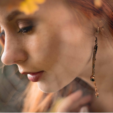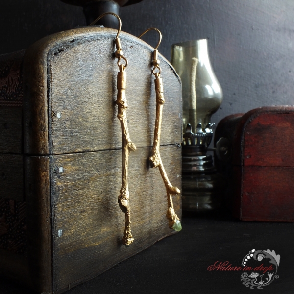 Gentle earrings made of gilded linden twigs will quickly become an integral part of your wardrobe. It looks fragile and unobtrusive and in conjunction with olivine, which helps to understand the meaning of life, even magically. Suitable for all festive occasions and for casual wear. Wherever you take them, they will constantly remind you of your truthfulness and connection with nature.