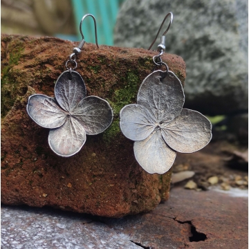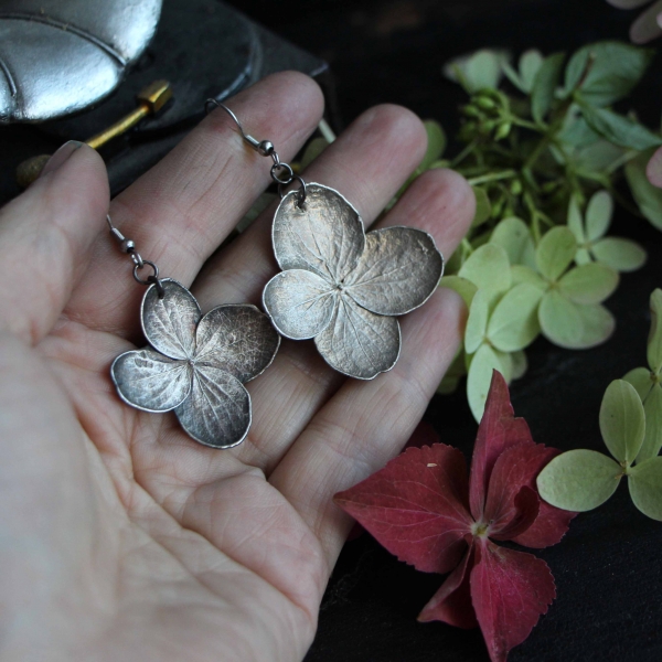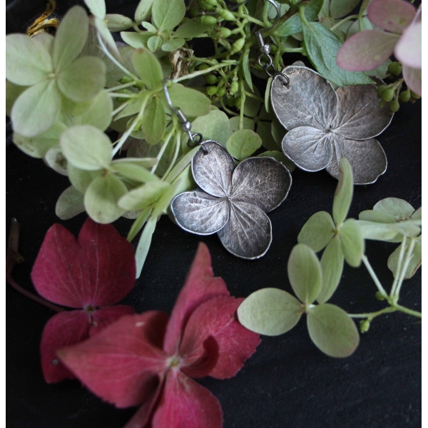 Material: hydrangea flowers, copper, silver-plated, patina, lacquer, surgical steel hooks