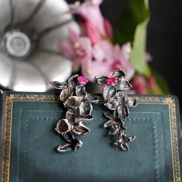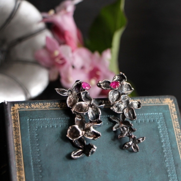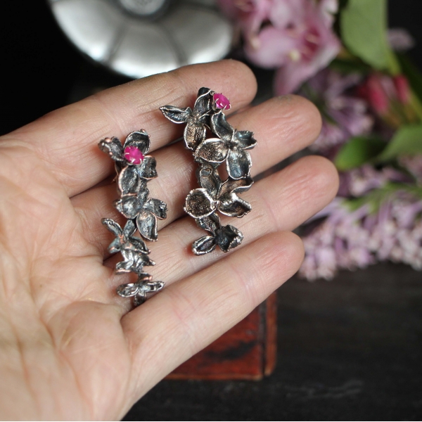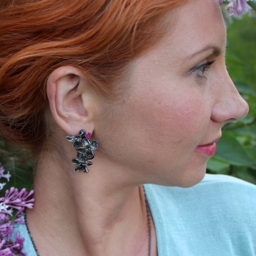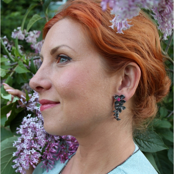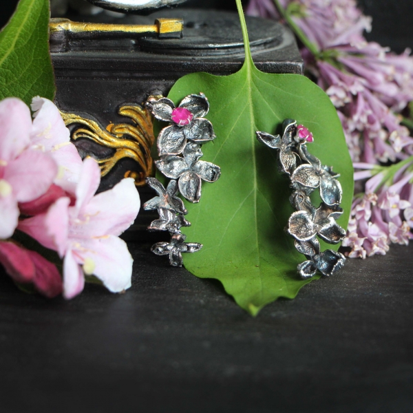 Delicate lilac flowers in a silver garb seem bathed in moonlight on a quiet, scented spring night.The otherworldly beauty of the flowers is further enhanced by a drop of ruby, playing brilliant reflections in the mirror of silver. Thus, earrings were born for a sensual and romantic woman who loves life and can enjoy all its small pleasures.Lilac, together with ruby, will support her creativity, openness and ability to follow her own heart.