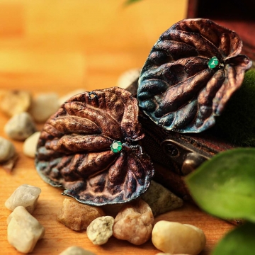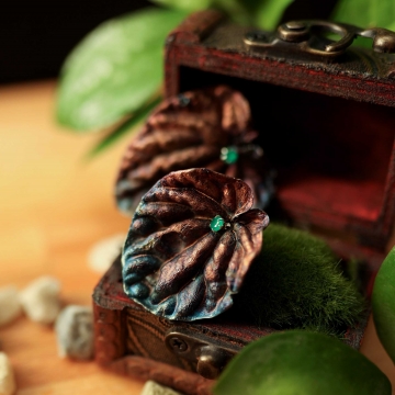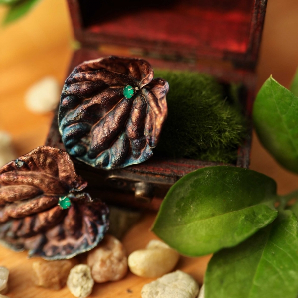 Material: peperomia leaves, copper, silver-plated, patina, antioxidation agent, silver 925 hooks, artificial emeralds 5 mm