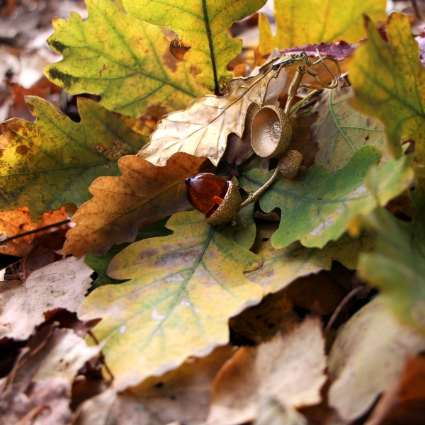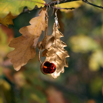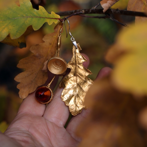 Material: oak leaves, copper, silver-plate, gilded, gilded surgical steel and surgical steel hooks