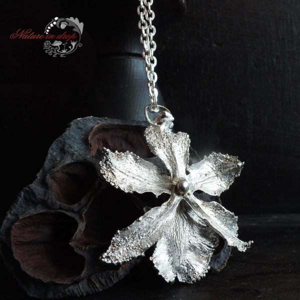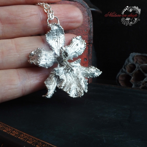 Material: orchid flower, copper, surgical steel, silver-plate, rhodium-plate