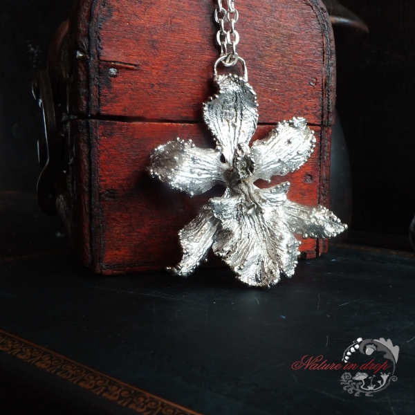 Material: orchid flower, copper, silver-plate, rhodium-plate, surgical steel chain