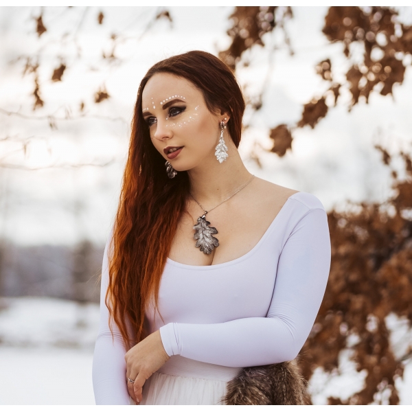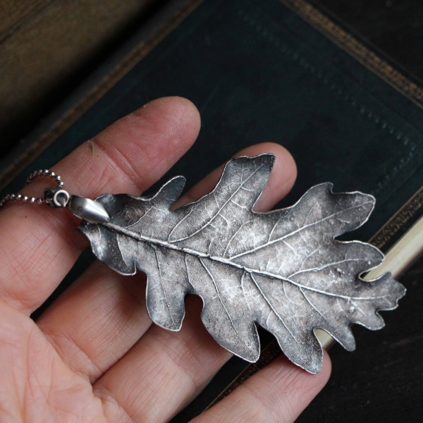 Material: oak leaf, copper, silver-plate, patina, antioxidation agent, surgical steel chain