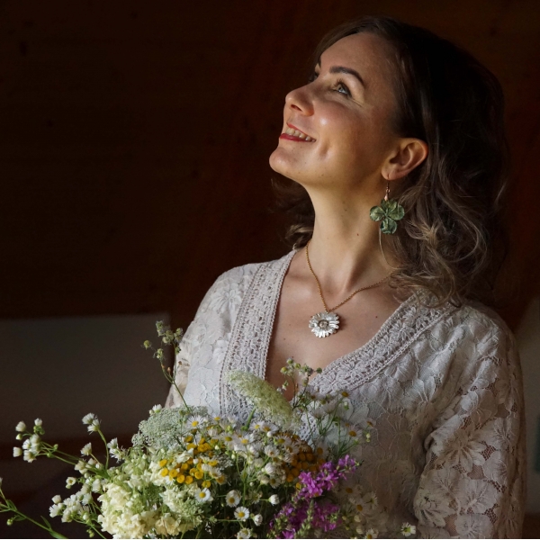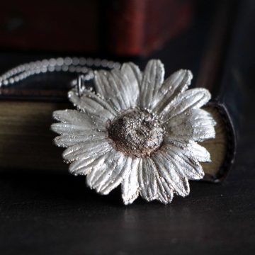 Material: marguerite, copper, silver-plate, patina, lacquer, surgical steel chain