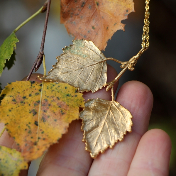 Material: birch leaves, copper, silver-plate, gold-plate, gilded surgical steel chain