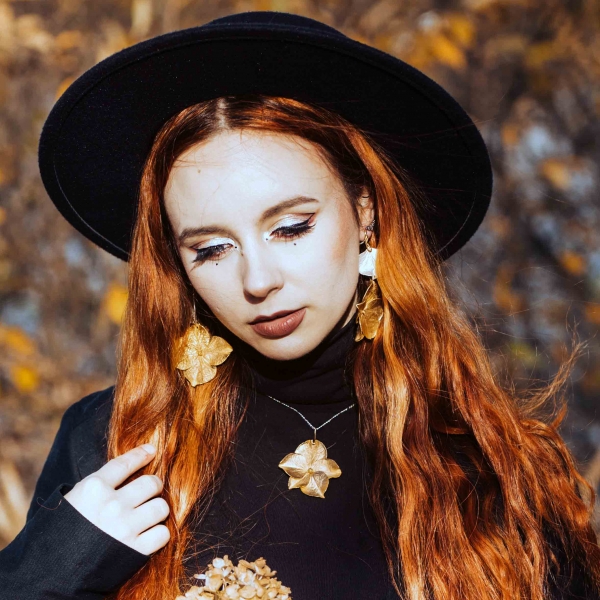 Material: hydrangea flower, copper, silver-plated, gilded, veins highlighted with silver, gilded surgical steel chain