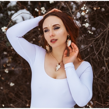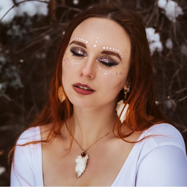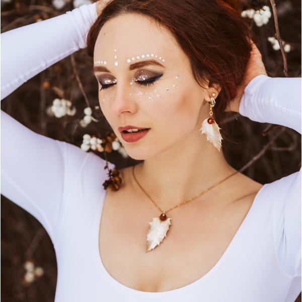 Material: holy leaves, copper, silver-plated, gilded, patina, carnelian, surgical steel chain and hooks